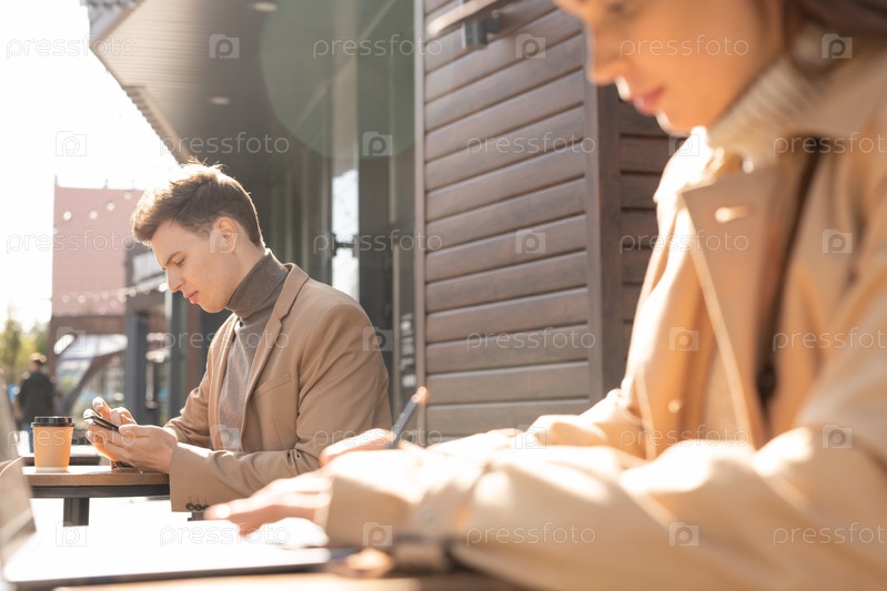 Боковой вид молодого элегантного мужчины в куртке и свитере, использующего смартфон на открытом воздухе