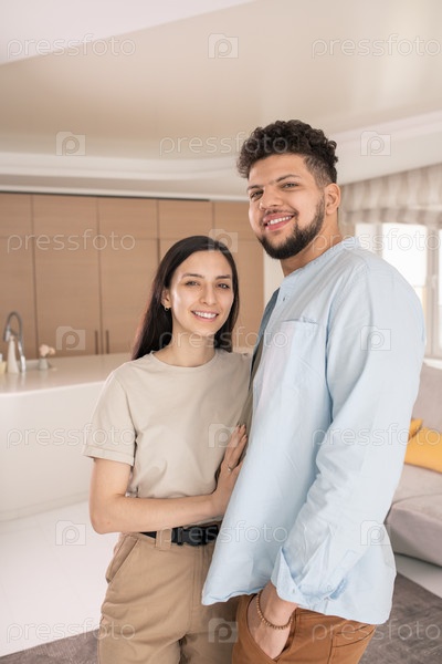 Молодая веселая пара в повседневной одежде смотрит на вас с улыбкой, стоя рядом друг с другом