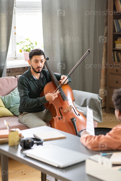 Молодая уверенная в себе учительница музыки объясняет школьнику, как играть на виолончели