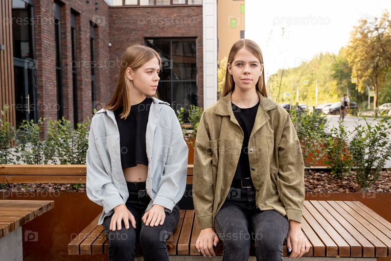 Одна из молодых близнецов смотрит на тебя, сидя на скамейке рядом со своей сестрой