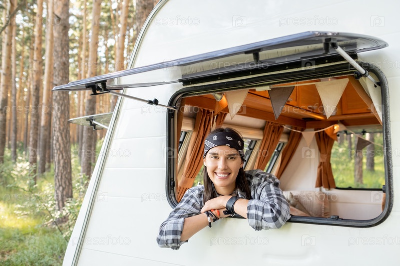 Счастливая молодая женщина в повязке на голове смотрит на тебя с зубчатой улыбкой