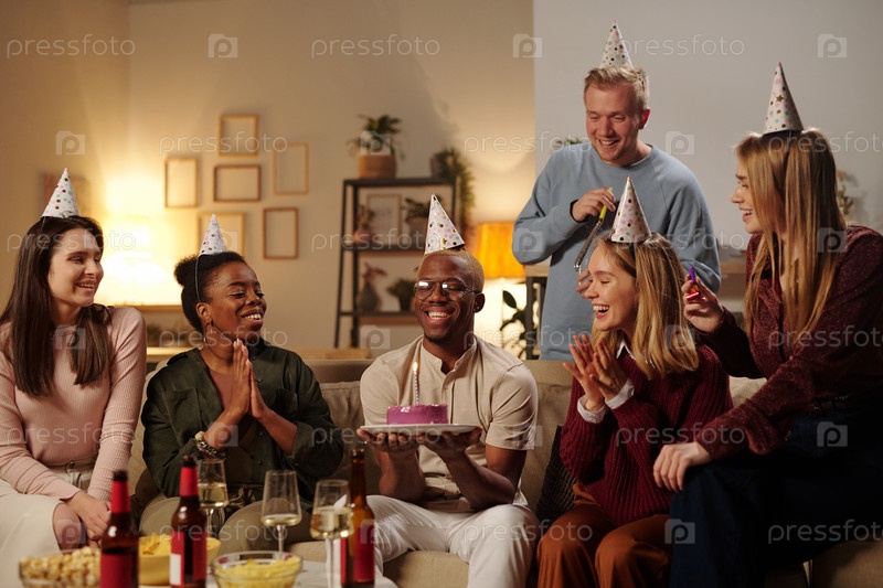 Счастливые молодые межкультурные друзья поздравляют африканского парня с днем рождения