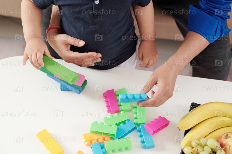 Отец и сын играют с игрушечными кирпичами