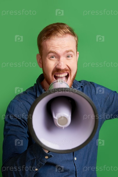 Эмоциональный человек делает объявление изолированно на зеленом фоне
