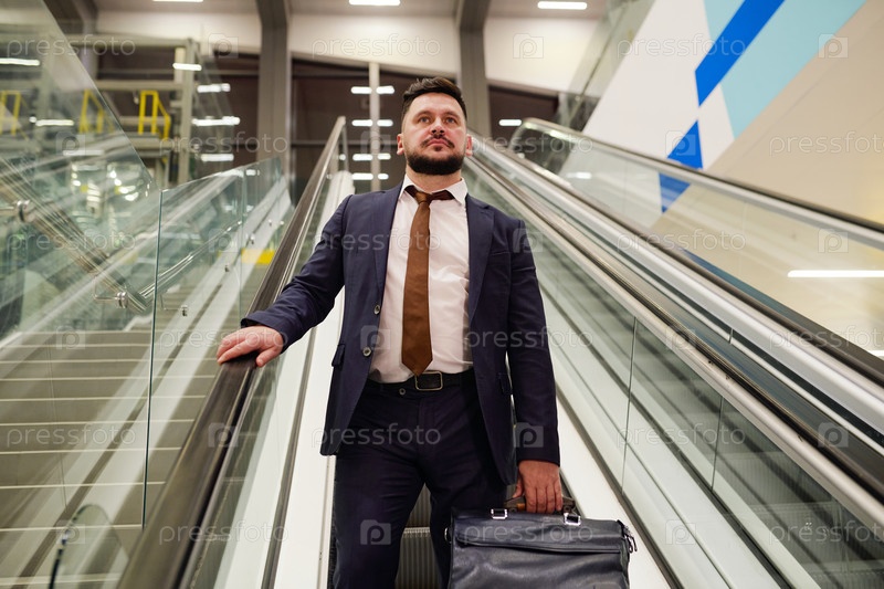 Бизнесмен спускается по эскалаторам