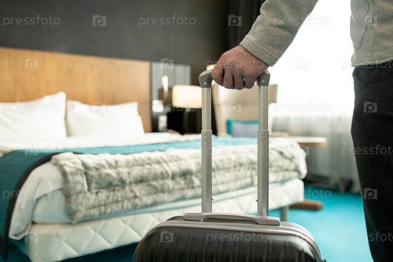 Рука мужского путешественника или бизнесмена в повседневной одежде, держащего ручку своего чемодана