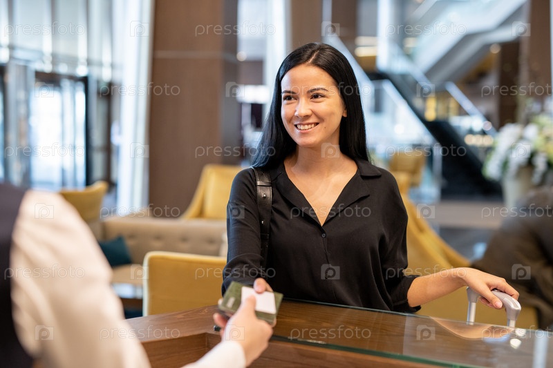 Счастливая молодая бизнесвумен или женщина-путешественница с багажом, передающая документы рецепционеру отеля