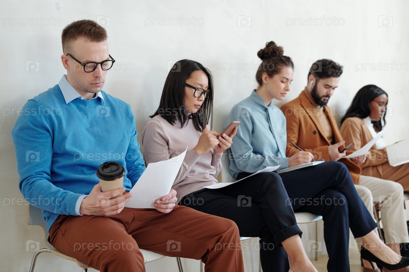 Несколько абитуриентов сидят вдоль стены, ожидая своей очереди на собеседование