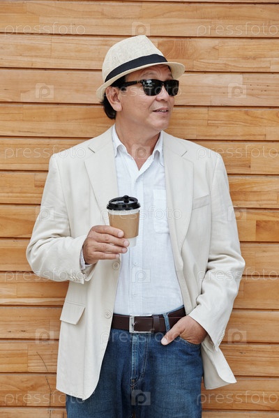 Красивый зрелый азиатский мужчина с кофе на вынос