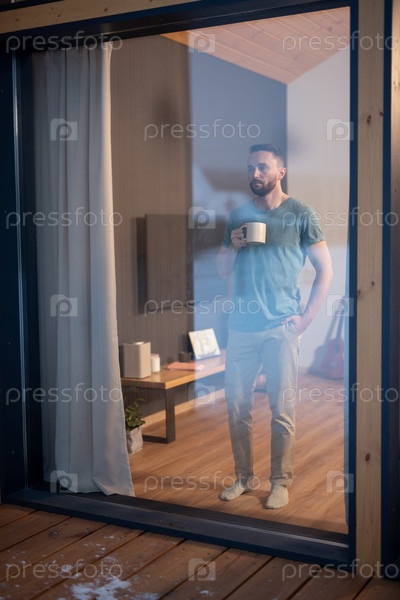 Молодой бородатый мужчина держит кружку с горячим напитком и смотрит через большое окно