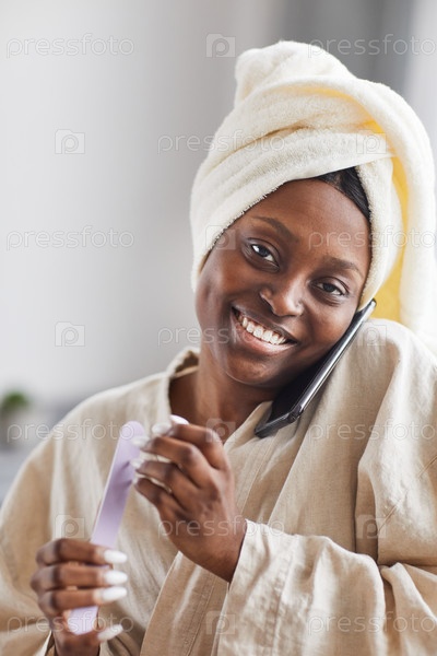Улыбающаяся афроамериканская женщина наслаждается днем красоты дома