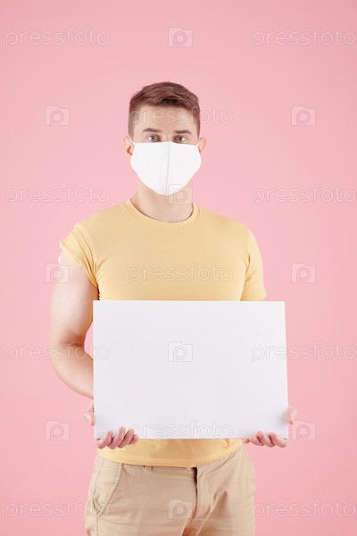 Человек в медицинской маске, показывающий плакат