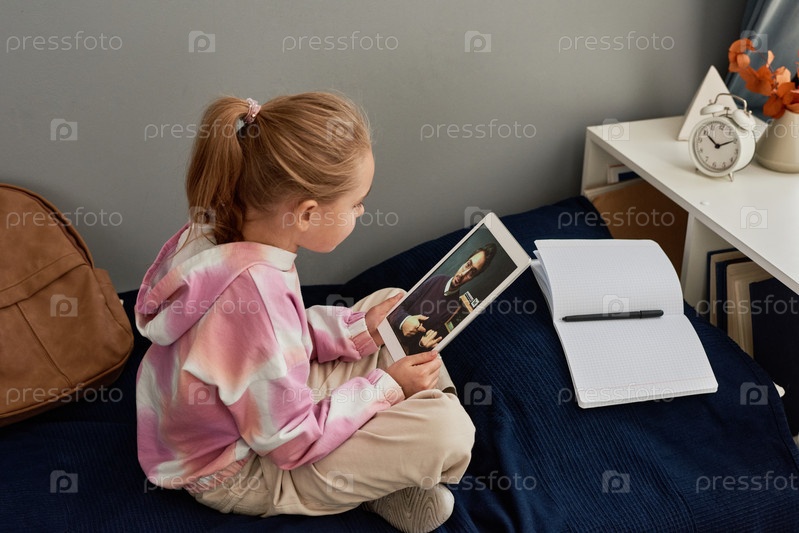 Сосредоточенная девушка с конюшкой сидит на кровати с открытой тетрадью и использует планшет для общения с репетитором