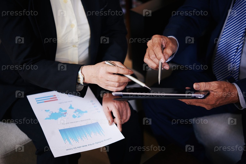 Старшие бизнесмены указывают на планшет