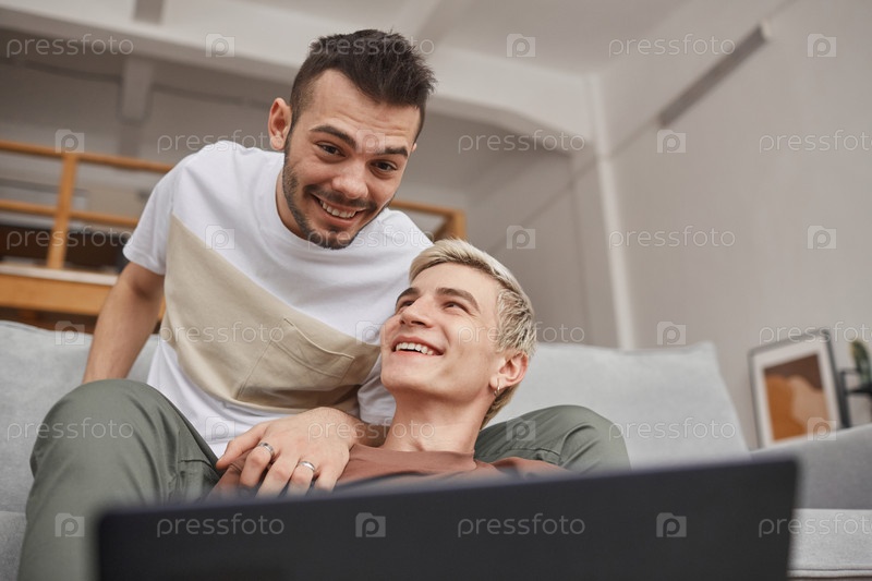 Два молодых человека, использующих ноутбук и улыбающихся