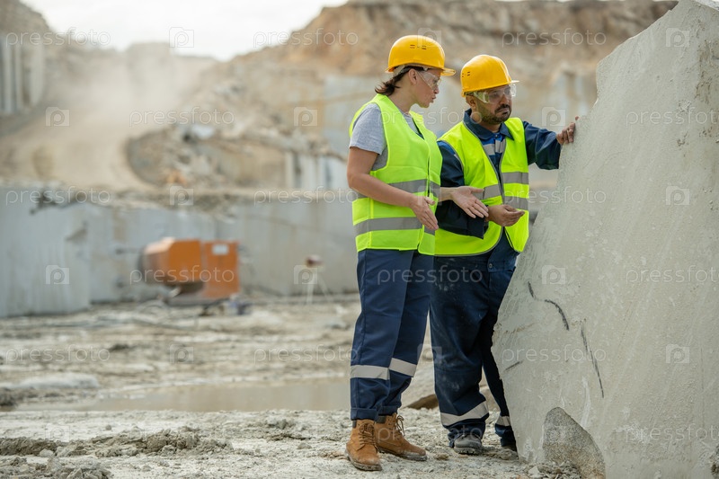 Два строителя в шапках и рабочей одежде обсуждают рабочие моменты