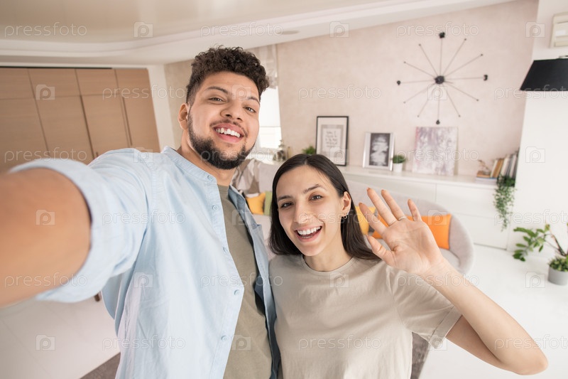 Молодая женщина машет рукой, пока ее муж делает селфи
