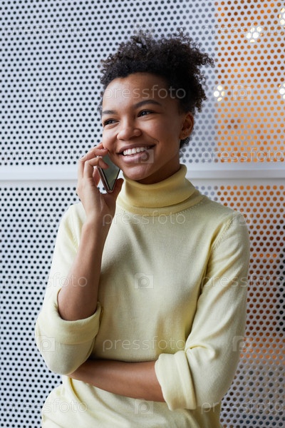 Улыбающаяся афроамериканская женщина разговаривает по телефону