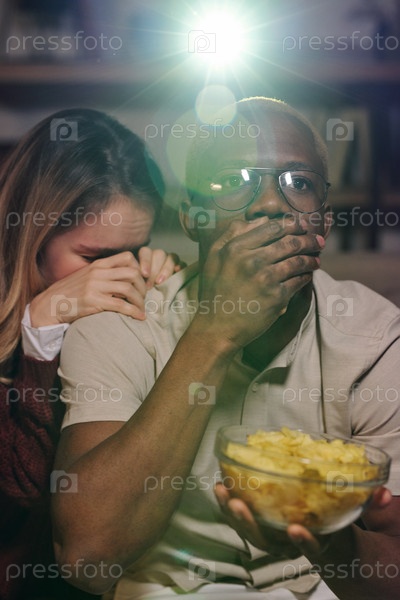 Шокированный парень африканской этнической принадлежности, закрывающий рот рукой во время просмотра фильма