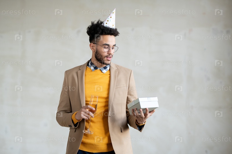 Молодой бизнесмен смешанной расы в умных повседневных одеждах и шапке на день рождения, держащей подарок