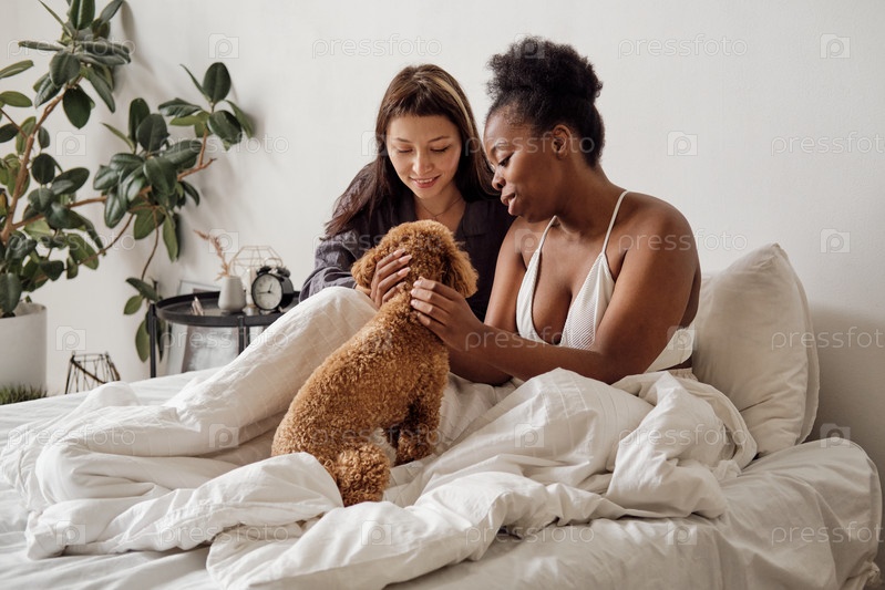 Две счастливые молодые женщины, обнимающие милого пса в постели