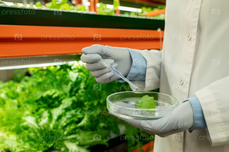 Перчатки рук биолога, держащего чашу Петри с образцом зеленого листа салата