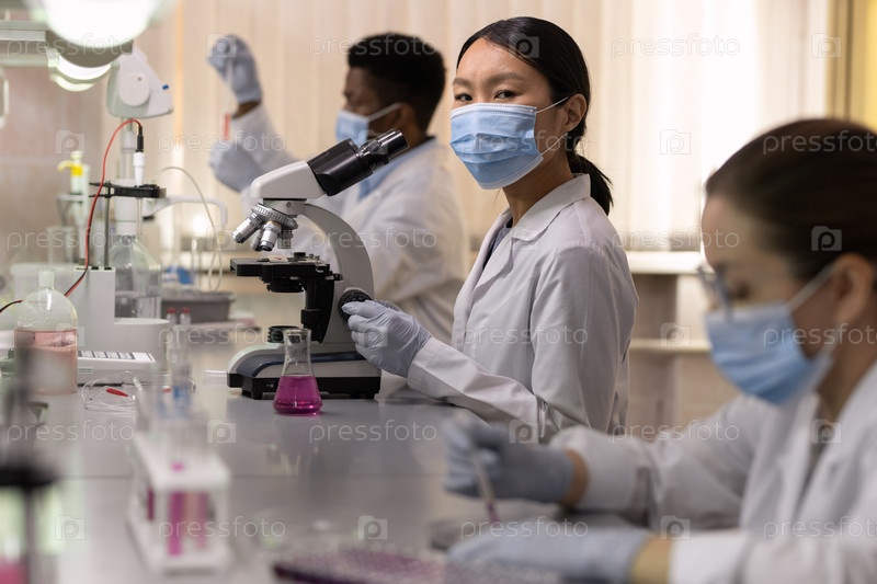 Молодая химик-женщина в защитной маске смотрит на вас на рабочем месте