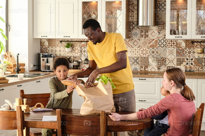 Милый мальчик помогает отцу выносить купленные продукты из бумажного пакета