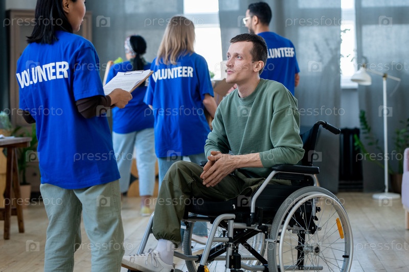 Инвалид в инвалидном кресле разговаривает с одним из волонтеров