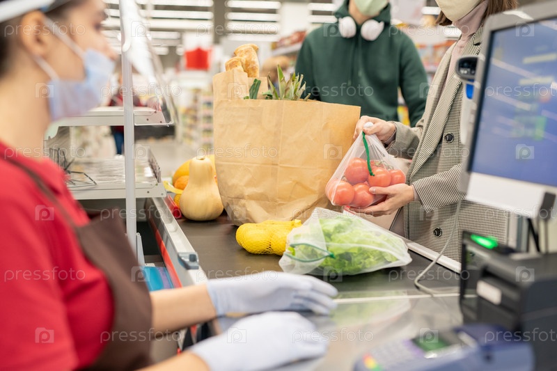 Молодая женщина-потребительница ставит свежие помидоры и другие продукты на прилавке