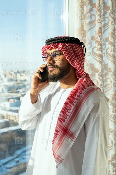 Молодой бородатый арабский бизнесмен разговаривает со своим смартфоном у окна в зале заседаний