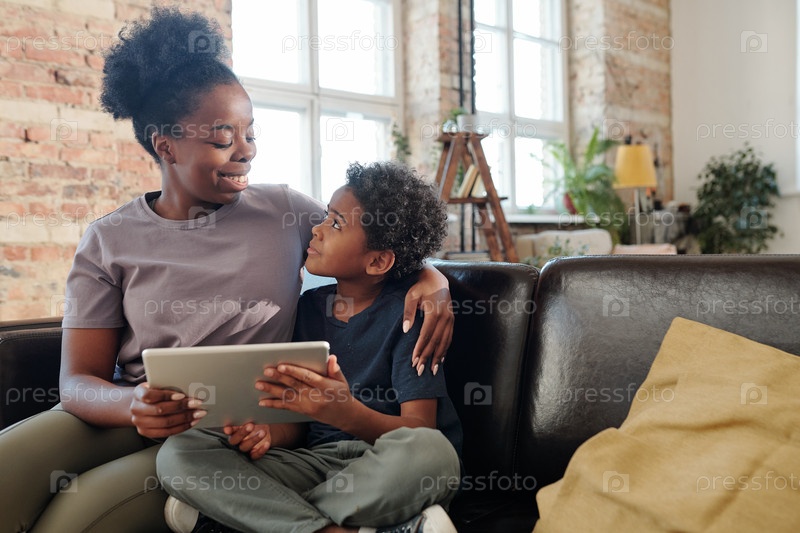 Счастливая молодая африканская женщина обнимает своего милого маленького сына и смотрит на него с улыбкой