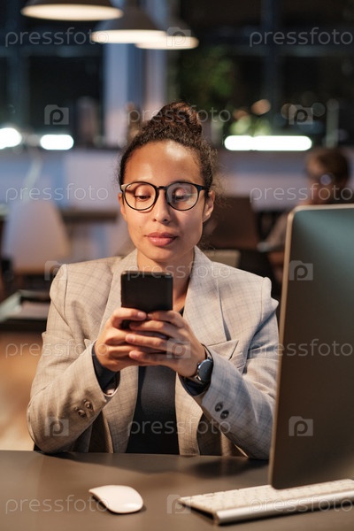 Перегруженная работой молодая женщина в очках сидит за столом и отправляет смс-сообщения на смартфон в темном офисе