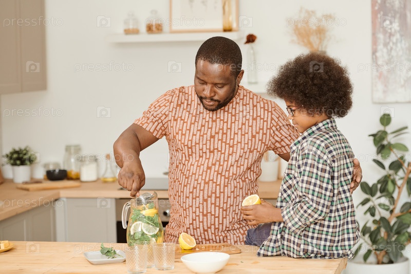Африканский мужчина смешивает лимонад в кружке, пока его маленький сын смотрит на него