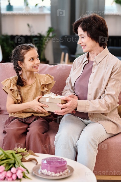 Счастливая зрелая женщина передает подарочный ящик своей внучке