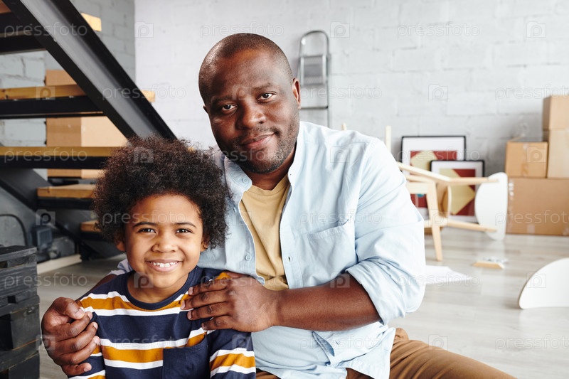 Счастливый африканский мужчина обнимает своего милого маленького сына в полосатом пуловере против лестницы в гостиной