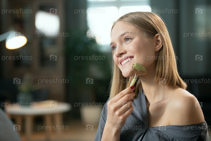Счастливая молодая женщина с зубчатой улыбкой, использующая массажный ролик на лице