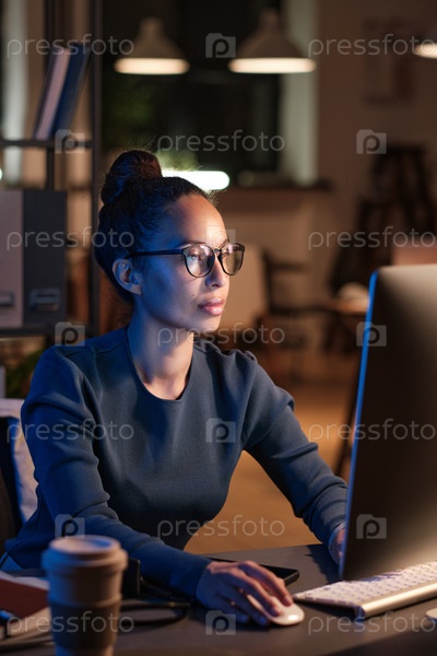 Концентрированная красивая мультиэтническая бизнесвумен в очках, сидящая за столом в темном офисе и работающая с онлайн-документами на компьютере