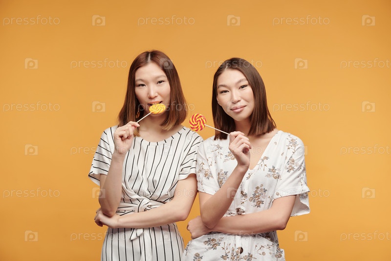 Молодые веселые женские близнецы азиатской этнической принадлежности в платьях, держащие леденец