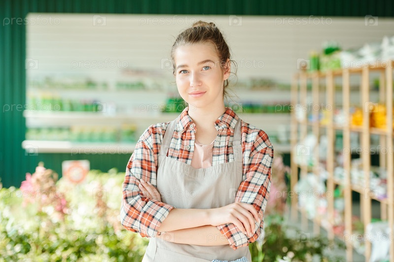 Молодая красивая фермерка или продавщица с перекрещенными руками, стоящая напротив интерьера супермаркета