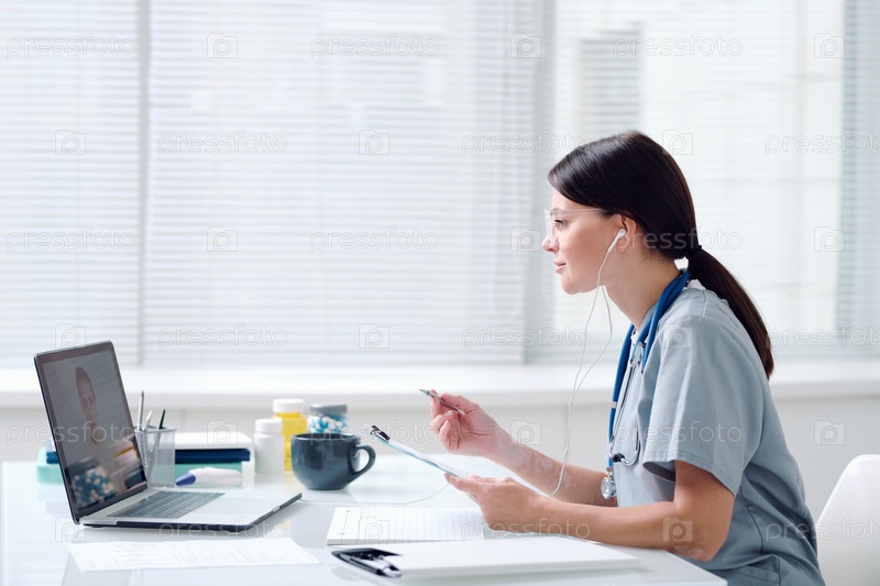 Боковой вид молодого врача в униформе и наушниках, слушающего онлайн пациента