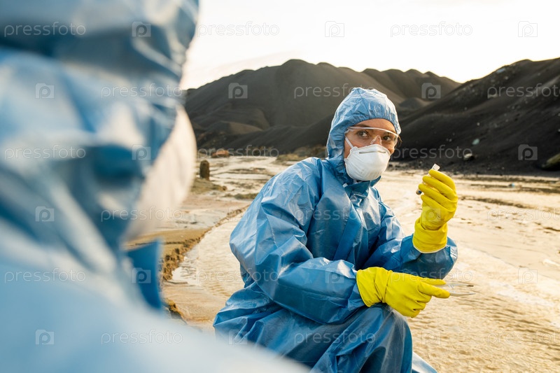 Женщина-эколог в защитных комбинезонах, очках и респираторах держит образец токсичной воды