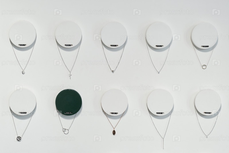 Два ряда серебряных цепей на круглых вешалках с ценовыми ярлыками