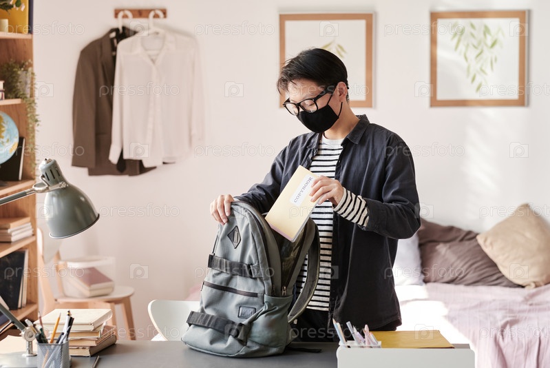 Азиатский студент-мужчина в тканевой маске стоит в уютной комнате и кладет книгу в сумку во время пандемии коронавируса