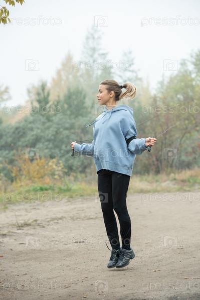 Девушка в голубой толстовке с капюшоном, черные носки и кроссовки тренируются со скакалкой