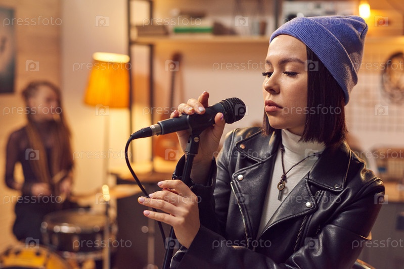 Женщина поет в микрофоне