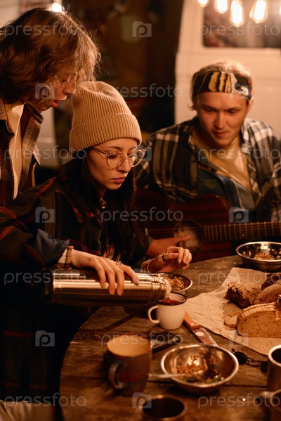 Люди пьют горячий чай на пикнике