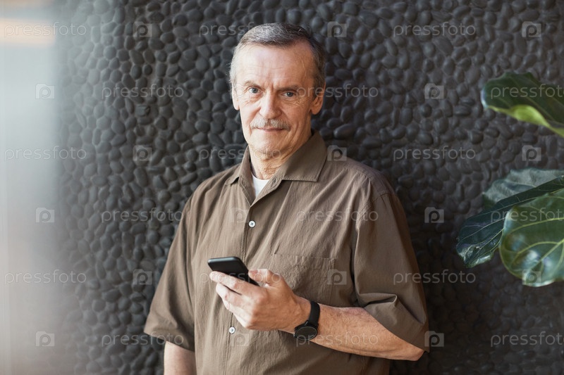 Улыбающийся пожилой мужчина в коричневой рубашке пользуется телефоном