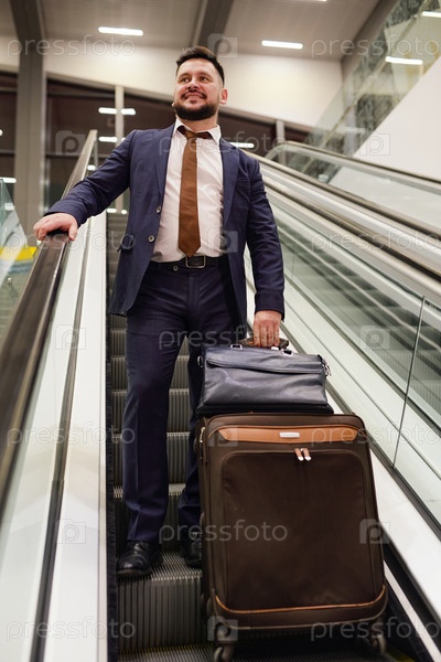 Веселый и успешный бизнесмен в темно-синем костюме, держащий черную кожаную сумочку и чемодан
