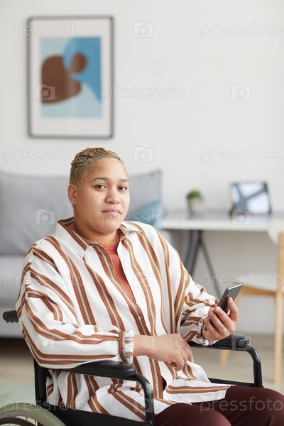 Современная женщина в инвалидном кресле держит смартфон